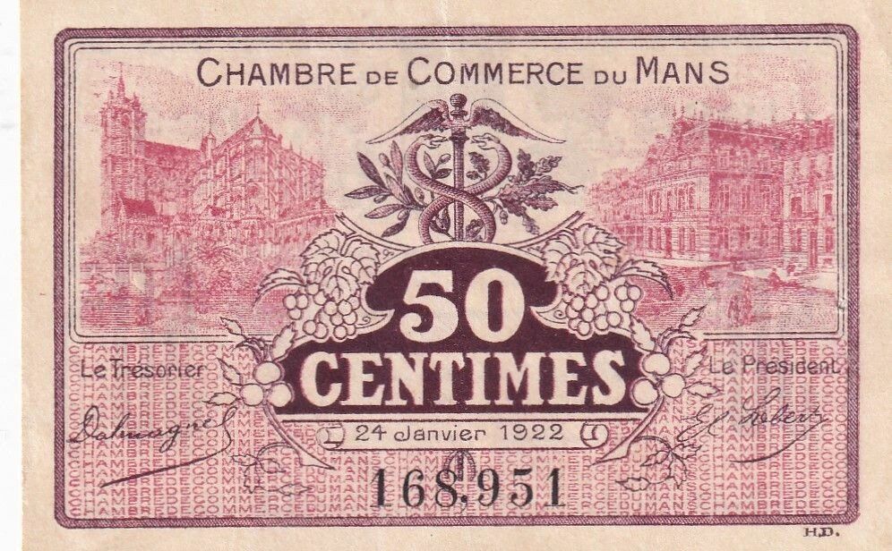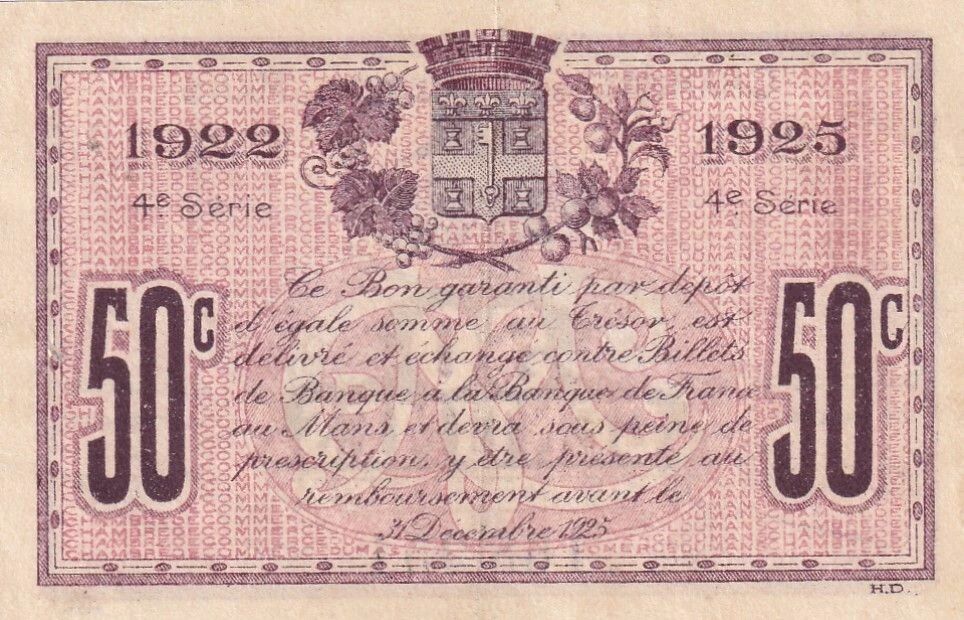 Ce billet de 50 centimes, émis par la Chambre de Commerce du Mans, date du 24 janvier 1922 et appartient à la 4ème série. Il s'agit d'un type de produit monétaire émis en France.