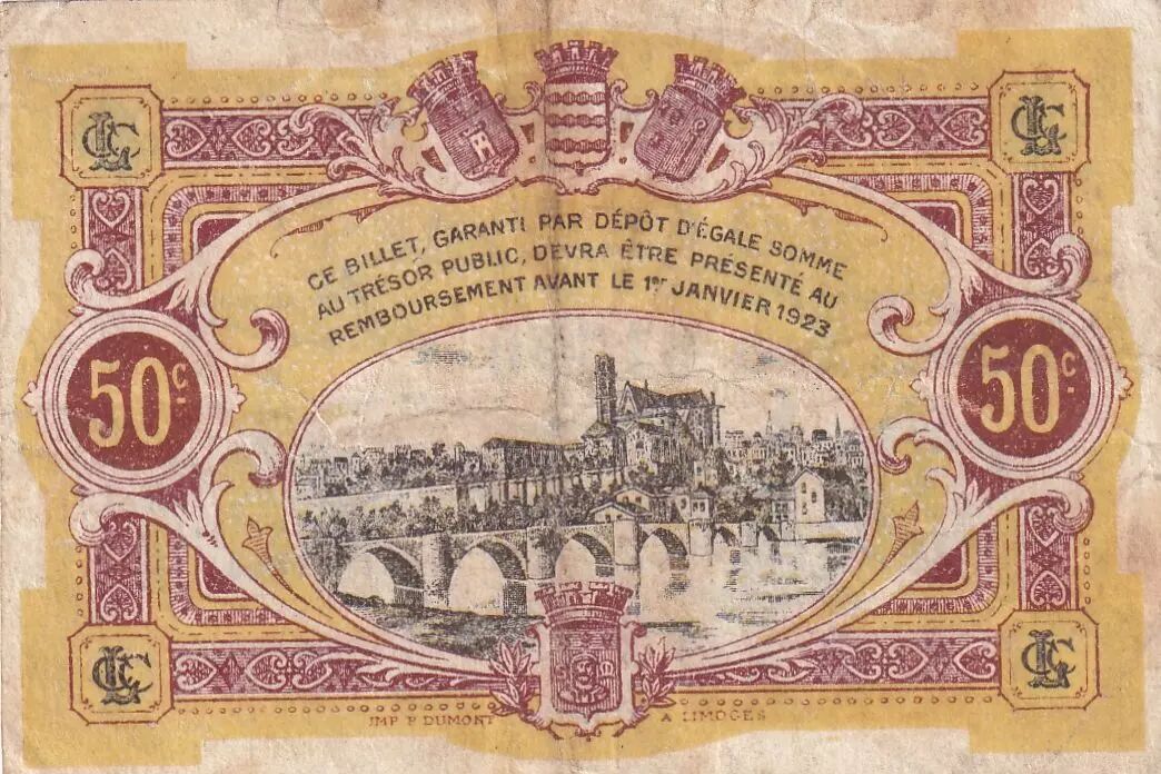 Le billet de 50 centimes émis par la Chambre de Commerce de Limoges en 1918 représente un exemple des émissions de nécessité produites en France durant la Première Guerre mondiale. Ce billet, d'une valeur de 50 centimes, porte l'inscription "CHAMBRE DE COMMERCE DE LIMOGES" en lettres majuscules sur sa face principale.