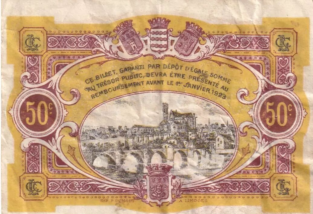 Ce billet de 50 centimes a été émis par la Chambre de Commerce de Limoges en 1918. Il s'agit d'un type de monnaie de nécessité, émise localement en période de pénurie de monnaie nationale durant la Première Guerre mondiale.