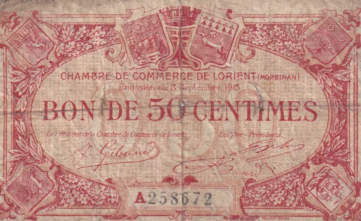Ce billet de 50 centimes a été émis par la Chambre de Commerce de Lorient en 1915, faisant partie de la Série A. Le recto du billet présente un ovale central intégré dans un cadre orné de motifs géométriques et végétaux. On observe un écu héraldique à chaque coin du cadre ainsi qu'un écu supplémentairePositionné sur la partie supérieure du billet. De part et d'autre d'une moucheture d'hermine couronnée, deux autres écus héraldiques sont représentés.