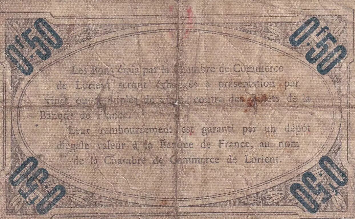 Le verso du billet arbore un ovale central inséré dans un cadre décoré de motifs végétaux. Les inscriptions en latin comprennent la valeur nominale répétée plusieurs fois ("0.50f") et une clause spécifiant que les bons émis par la Chambre de Commerce de Lorient seront échangés contre des billets de la Banque de France par vingtaine ou multiples de vingt. Il est également précisé que leur remboursement est garanti par un dépôt d'égale valeur à la Banque de France, au nom de la Chambre de Commerce de Lorient.