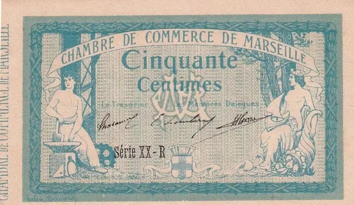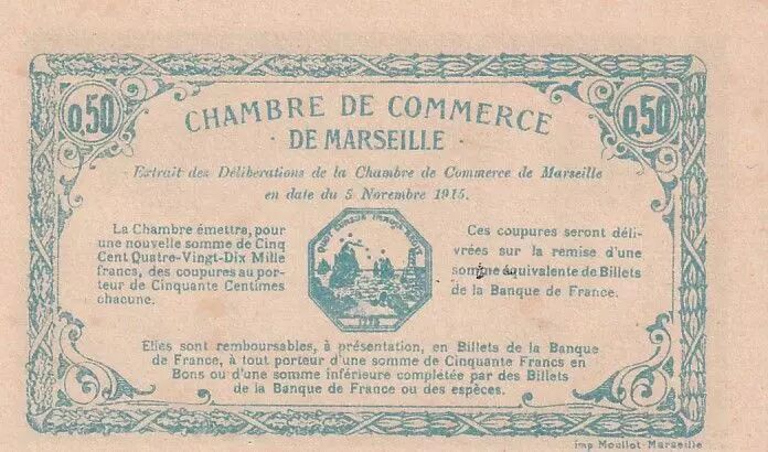 Le billet de 50 Centimes émis par la Chambre de Commerce de Marseille, daté du 5 novembre 1915, représente une forme de monnaie de nécessité émise dans un contexte économique particulier. Ce type de billet a été produit pour pallier le manque de monnaie divisionnaire en circulation pendant la Première Guerre mondiale.