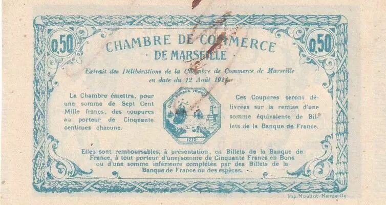 Ce billet de 50 centimes a été émis par la Chambre de Commerce de Marseille le 12 août 1914. Il s'agit d'une coupure de nécessité, émise dans un contexte de pénurie de monnaie divisionnaire durant la Première Guerre Mondiale.