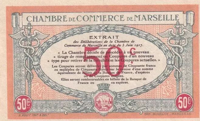 Le verso du billet répète l'inscription "CHAMBRE DE COMMERCE DE MARSEILLE" ainsi que la valeur nominale "50 c". On y trouve également des extraits des délibérations de la Chambre de Commerce de Marseille datées du 5 juin 1917. Le nom de H. Rouit, crédité comme "INVT & DEL" (inventeur et dessinateur), est présent, ainsi que la mention "IMP. MOULLOT . MARSEILLE", indiquant l'imprimeur.