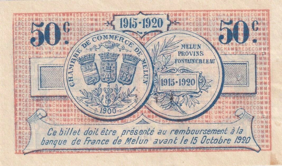 Plusieurs inscriptions figurent au verso. Les années "1915-1920" indiquent la période de validité du billet. La mention "MELUN - PROVINS - FONTAINEBLEAU" suggère l'étendue géographique de la juridiction de la Chambre de Commerce. Une clause importante précise que le billet devait être présenté au remboursement à la Banque de France de Melun avant le 15 octobre 1920. La valeur faciale "50. C" est répétée, assurant une identification claire. Le billet est dépourvu de filigrane.
