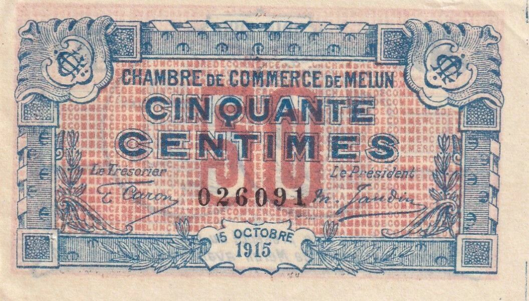 Le billet présente une typographie soignée, avec la valeur nominale "50 centimes" clairement indiquée. La mention "Chambre de Commerce de Melun" atteste de l'institution émettrice, soulignant le rôle des chambres de commerce dans l'émission de monnaie de nécessité durant cette période. La date d'émission, "15 OCTOBRE 1915", est également mentionnée, permettant de situer précisément l'émission de ce billet dans le temps.