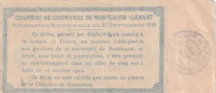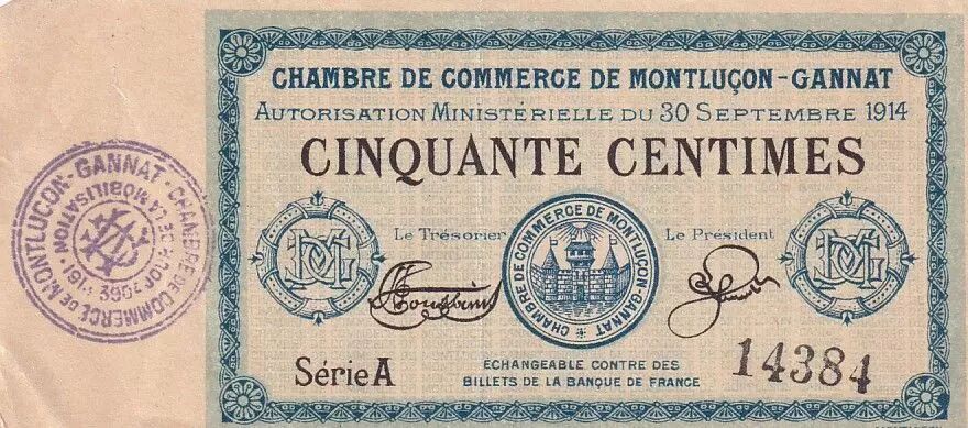 Ce billet de 50 centimes a été émis par la Chambre de Commerce de Montluçon-Gannat en 1914. Il s'agit d'une émission de nécessité, utilisée en France durant la Première Guerre mondiale pour pallier le manque de petite monnaie.