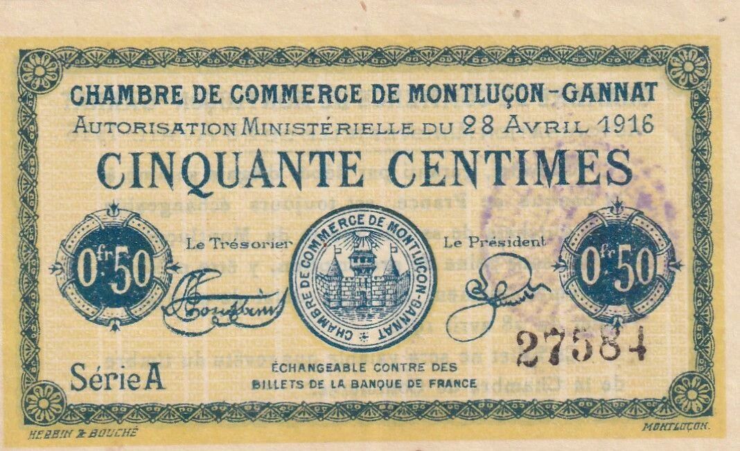 Ce billet de nécessité, émis par la Chambre de Commerce de Montluçon-Gannat, affiche une valeur faciale de 50 centimes. Daté du 28 avril 1916, il s'inscrit dans la Série A et porte le numéro 27584.