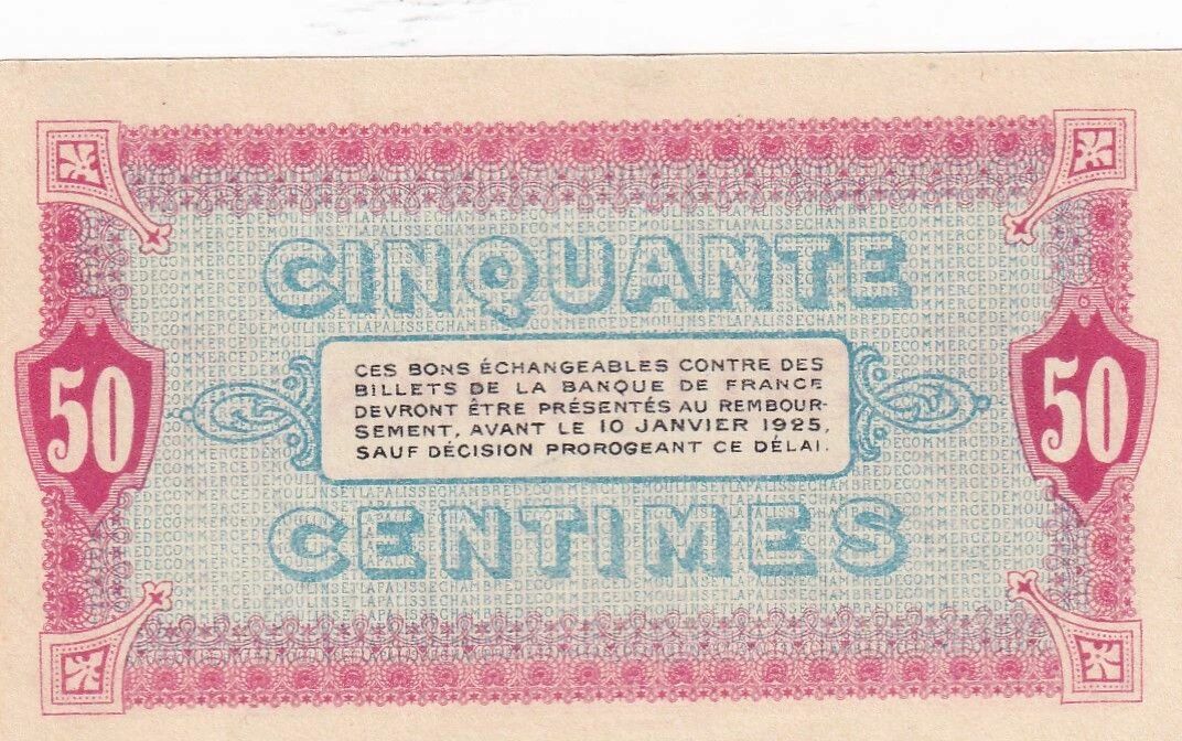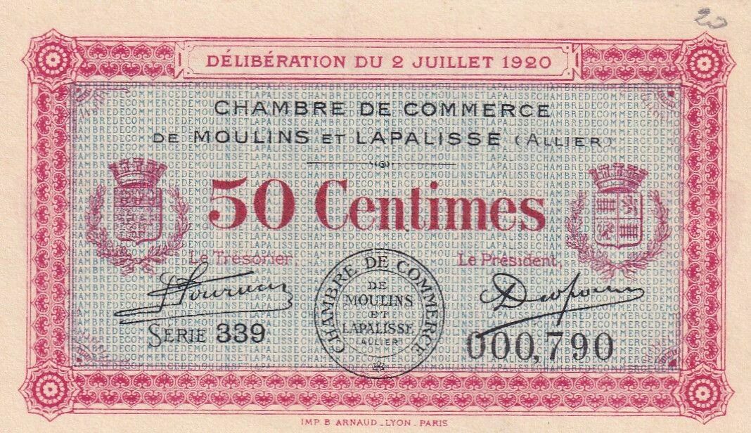 Ce billet de 50 centimes a été émis par la Chambre de Commerce de Moulins et Lapalisse, dans le département de l'Allier, en France. Il fait partie de la série 339 et a été imprimé le 2 juillet 1920.
