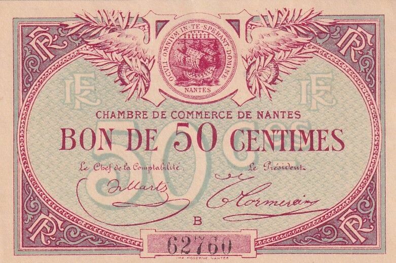 Le billet de 50 centimes émis par la Chambre de Commerce de Nantes, appartenant à la Série B, présente un recto avec un cadre simple. Ce cadre est interrompu dans sa partie supérieure par un médaillon de forme ovale. Ce médaillon est orné d'une nef en son centre et est surmonté d'un motif ailé, flanqué de branches. La mention "CHAMBRE DE COMMERCE DE NANTES" est imprimée, suivie de la valeur nominale "BON DE 50 CENTIMES" et de la désignation de la série "Série B". On trouve également les signatures du Chef de la Comptabilité et du Président. La devise "OCVLI OMNIVM IN TE SEPARANT DOMINE" est inscrite, et les initiales "FR" sont répétées à deux endroits. La mention "IMP MODERNE NANTES" indique l'imprimeur.