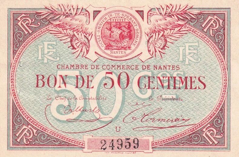 Ce billet de 50 centimes a été émis par la Chambre de Commerce de Nantes en 1918. Il appartient à la Série U. Le recto du billet présente un cadre simple, interrompu dans sa partie supérieure par un médaillon ailé orné de branches et d'une nef. On y trouve l'inscription "CHAMBRE DE COMMERCE DE NANTES" et la valeur nominale "BON DE 50 CENTIMES". Un numéro de série, "24959", est également visible, ainsi que les signatures du Chef de la Comptabilité et du Président. La devise "OCVLI OMNIVM IN TE SEPARANT DOMINE" est inscrite au-dessus du médaillon. La mention "IMP MODERNE NANTES" indique l'imprimeur.