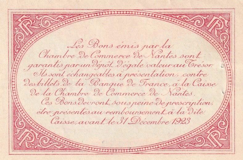 Le verso du billet est caractérisé par un cadre simple. L'inscription principale précise que les bons émis par la Chambre de Commerce de Nantes sont échangeables contre des billets de la Banque de France par multiples de dix. Elle indique également que leur remboursement est garanti par un dépôt d'égale valeur à la Banque de France au nom de la Chambre de Commerce de Nantes.