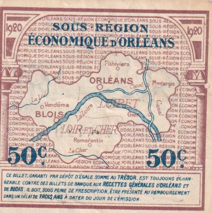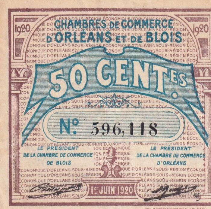 Ce billet de 50 centimes a été émis le 1er juin 1920 par les Chambres de Commerce d'Orléans et de Blois, en France. Il s'agit d'un billet de nécessité, émis dans un contexte économique difficile après la Première Guerre mondiale.