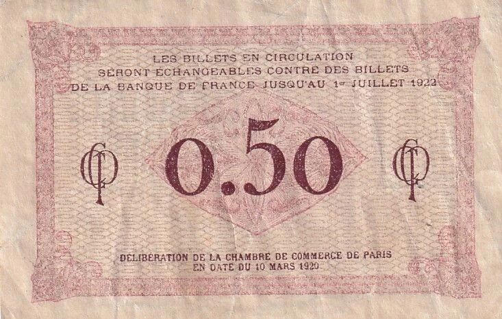Le verso du billet reprend le cadre à motifs géométriques, créant une continuité esthétique. L'inscription principale informe le public que ces billets étaient échangeables contre des billets de la Banque de France jusqu'au 1er juillet 1922, soulignant leur nature temporaire et leur fonction de remplacement de la monnaie officielle. La valeur nominale "0.50" est également répétée. La mention de la délibération de la Chambre de Commerce de Paris en date du 10 mars 1920 confère un caractère officiel à cette émission. L'absence de filigrane est une caractéristique technique notable de ce billet.