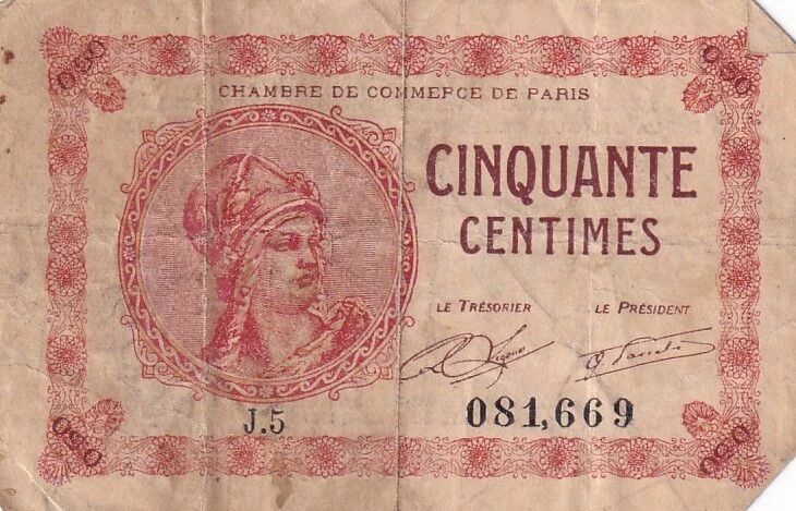 Sur le recto, on observe un médaillon positionné à gauche. Il arbore le buste de Minerve, reconnaissable à son casque et représentée de trois quarts face. Les inscriptions principales incluent la mention de l'institution émettrice, "CHAMBRE DE COMMERCE DE PARIS", ainsi que la valeur nominale, "CINQUANTE CENTIMES". Les signatures du trésorier et du président complètent cette face, avec l'identification de la série "J.5" et le numéro de contrôle "081.669".