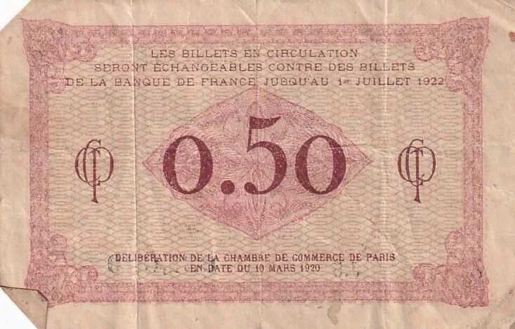 Le verso du billet reprend le cadre à motifs géométriques. L'inscription principale informe le public que les billets en circulation seraient échangeables contre des billets de la Banque de France jusqu'au 1er juillet 1922. La valeur nominale "0.50" est également présente, accompagnée de la mention de la délibération de la Chambre de Commerce de Paris, datée du 10 mars 1920.