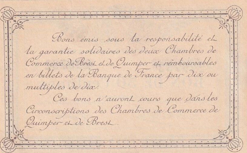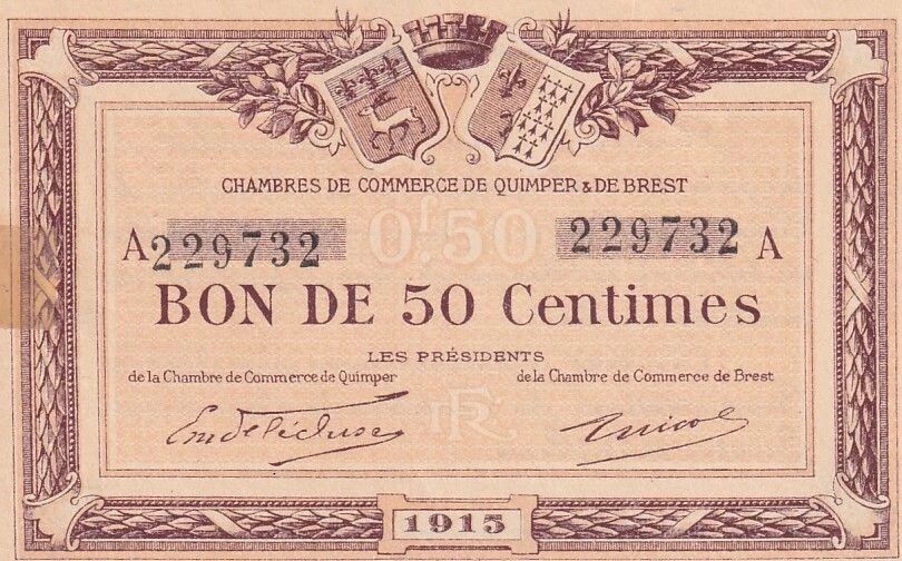 Ce billet de 50 centimes a été émis par la Chambre de Commerce de Quimper et Brest en 1915, Série A. Il s'agit d'une émission de nécessité, datant de la Première Guerre mondiale. Ce type de billet a été mis en circulation en raison de la pénurie de monnaie métallique durant cette période.