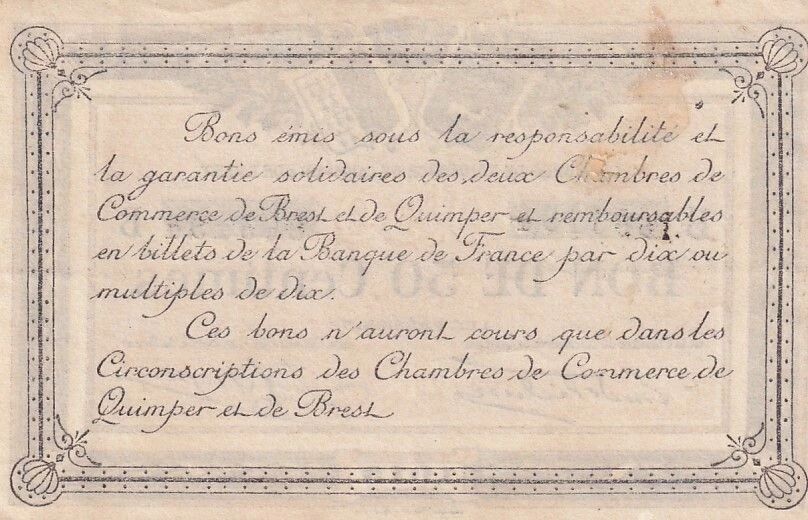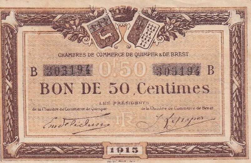 Le billet de 50 centimes de la Chambre de Commerce de Quimper et Brest, datant de 1915, représente une émission de nécessité de la France durant la Première Guerre mondiale. Ce billet appartient à la Série B et porte le numéro 303194.