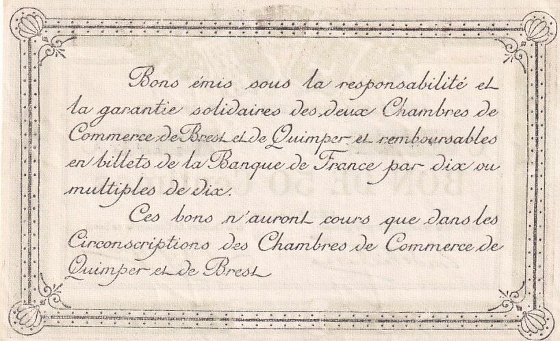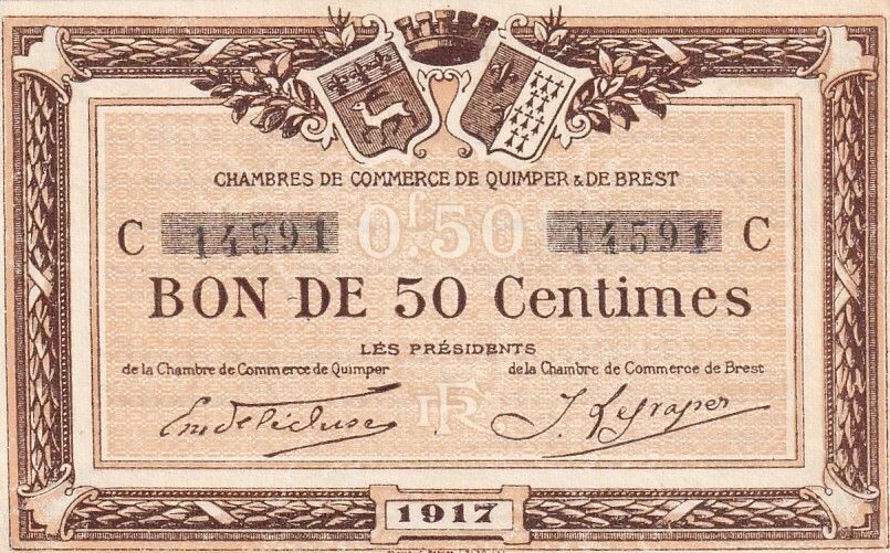 Ce billet de 50 centimes a été émis par la Chambre de Commerce de Quimper et Brest en 1917. Il appartient à la série C et constitue une forme de monnaie de nécessité émise en France durant la Première Guerre mondiale. Ces émissions étaient souvent locales et destinées à pallier le manque de monnaieDivision administrative, territoriale. courante.