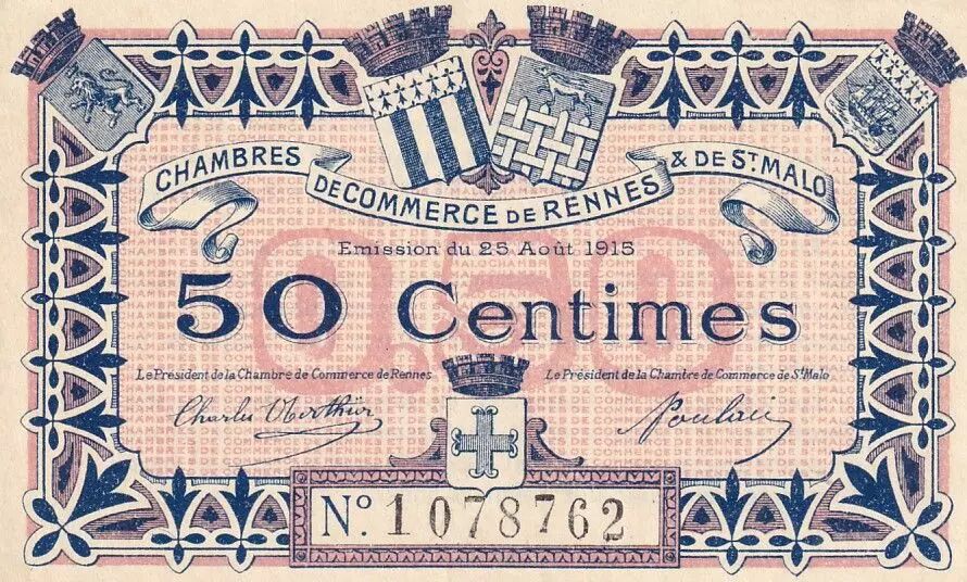 Ce billet de 50 centimes a été émis en 1915 par les Chambres de Commerce de Rennes et de Saint-Malo. Il s'agit d'une émission spécifique datée du 25 août 1915, conçue pour circuler dans les zones d'influence de ces deux chambres de commerce.