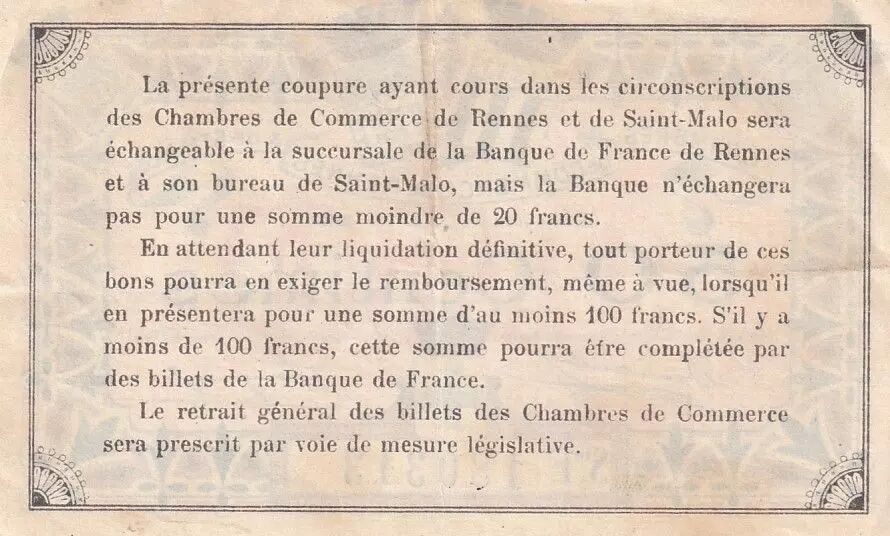 Le verso du billet détaille les conditions d'échange et de remboursement de cette coupure. Il est précisé que le billet est valable dans les circonscriptions des chambres de commerce de Rennes et de Saint-Malo et qu'il est échangeable à la succursale de la Banque de France de Rennes et à son bureau de Saint-Malo. Toutefois, la Banque de France n'effectue pas d'échange pour une somme inférieure à 20 francs.