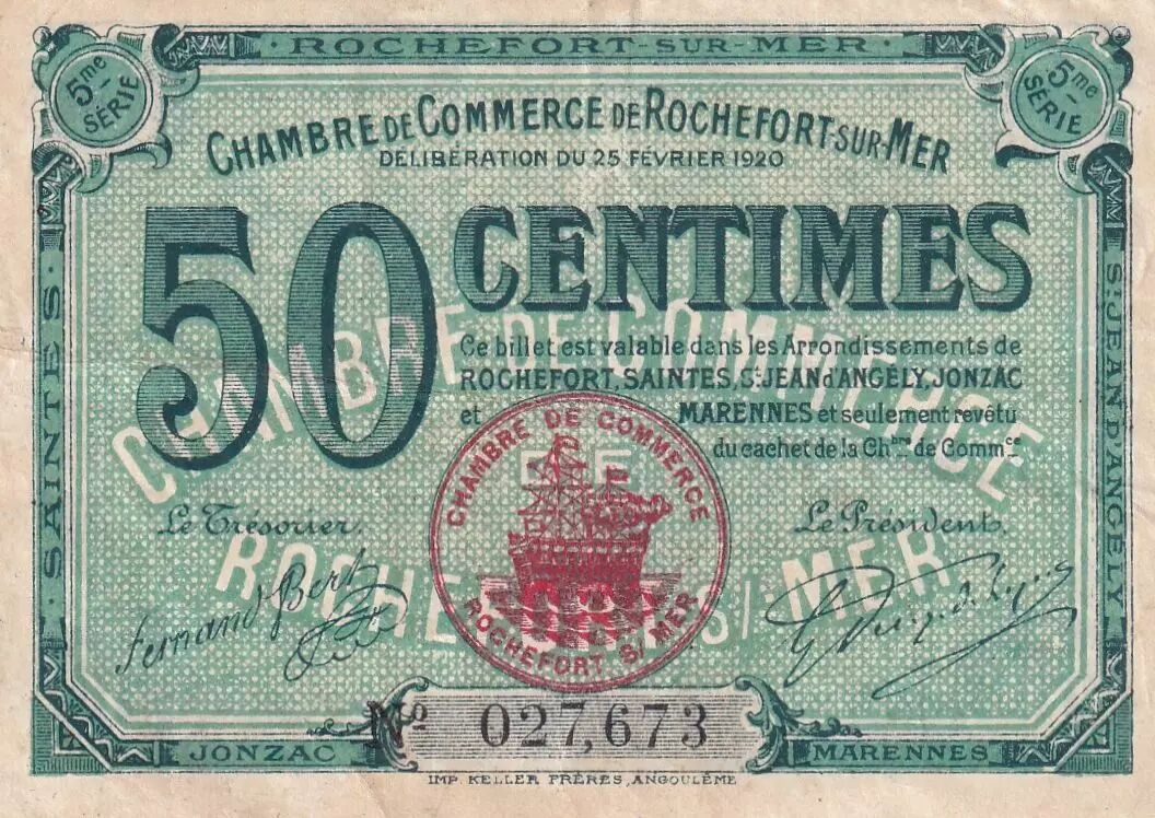 The obverse of the banknote features the following inscriptions: "5ème SERIE" (5th SERIES) at the top, followed by "CHAMBRE DE COMMERCE DE ROCHEFORT-SUR-MER" (Chamber of Commerce of Rochefort-sur-Mer). The mention "Délibération du 25 février 1920" (Deliberation of February 25, 1920) indicates the date of the decision authorizing the issuance of this banknote. The face value, "50 CENTIMES", is clearly displayed. The signatures of the Treasurer and the President of the Chamber of Commerce are also present. A serial number, "027.673", is printed on the banknote. The mention "IMP KELLER FRÉRES ANGOULÊME" indicates the printer responsible for the manufacture of this banknote.