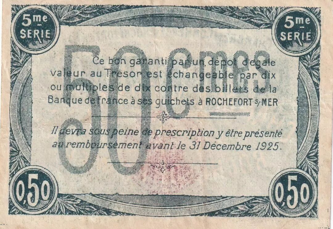 This 50 centime banknote was issued by the Chamber of Commerce of Rochefort-sur-Mer, France. It belongs to the 5th series and was put into circulation following the deliberation of February 25, 1920.