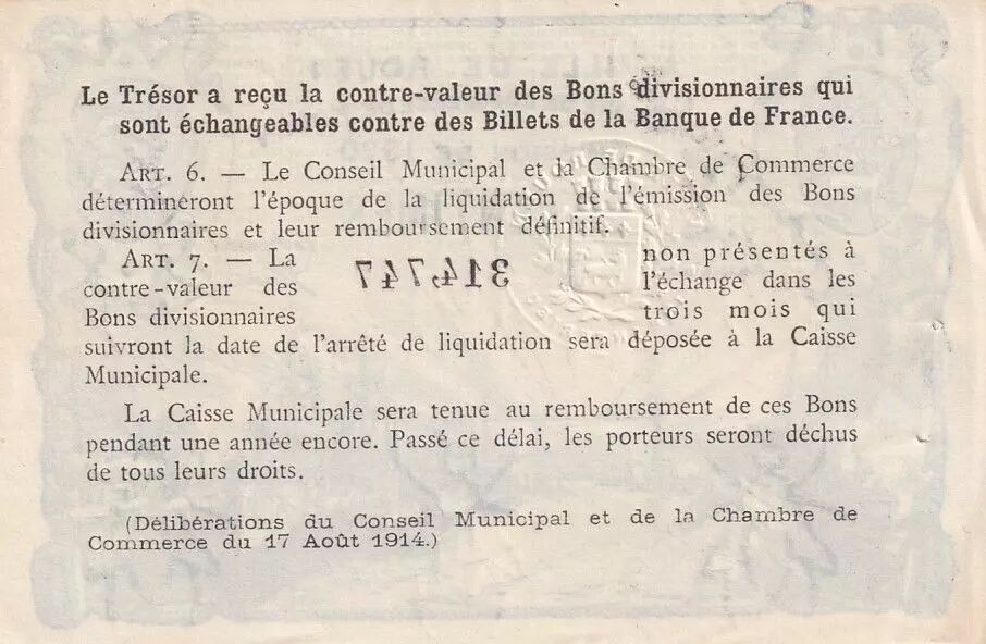 Le verso du billet porte l'inscription "Le Trésor a reçu la contre-valeur...", suivie d'une référence aux délibérations du Conseil Municipal et de la Chambre de Commerce du 17 août 1914.