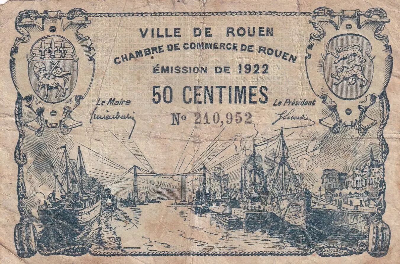 Ce billet de 50 centimes a été émis par la Chambre de Commerce de Rouen en 1922. Il s'agit d'un billet de nécessité, émis dans un contexte économique particulier.