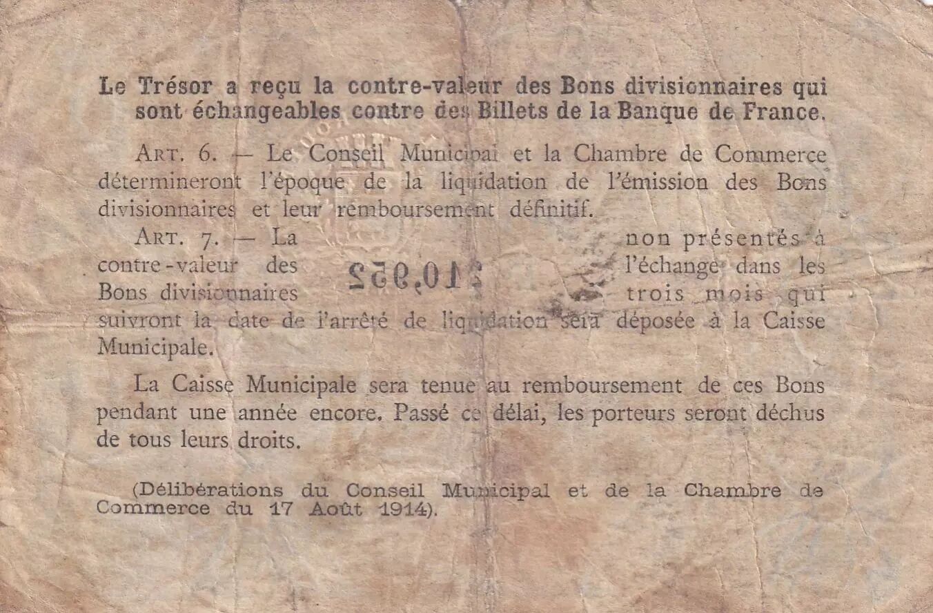 Le verso du billet porte l'inscription "Le Trésor a reçu la contre-valeur... (Délibérations du Conseil Municipal et de la Chambre de Commerce du 17 août 1914.)". Cette mention fait référence aux délibérations qui ont autorisé l'émission de ce type de billet.