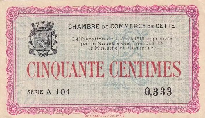 L'imprimeur de ce billet est B. Arnaud, une entreprise basée à Villeurbanne, en France, qui a opéré de 1898 à 1990. Il est à noter que l'orthographe de la ville de Sète est "CETTE" sur ces billets jusqu'en 1927.