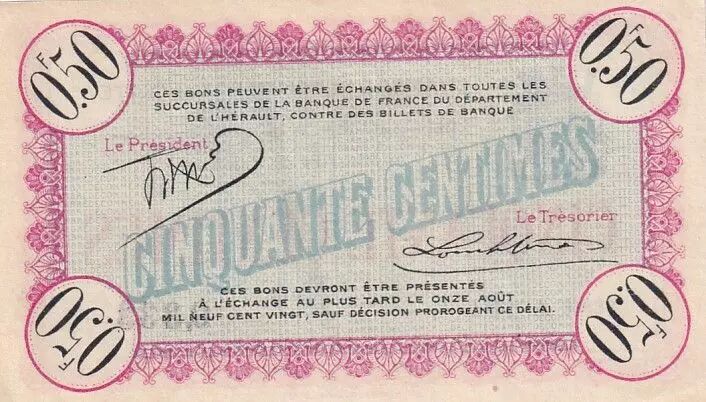 Le verso du billet précise les conditions d'échange : "Ces bons peuvent être échangés dans toutes les succursales de la banque de France du Département de l'Hérault, contre des billets de banque." Les fonctions du Président et du Trésorier sont mentionnées, respectivement en haut à gauche et en haut à droite. La date limite d'échange est fixée au "onze août mil neuf cent vingt", avec la possibilité d'une prolongation de ce délai. Le billet est dépourvu de filigrane.