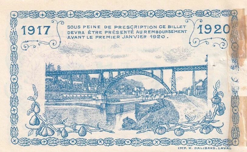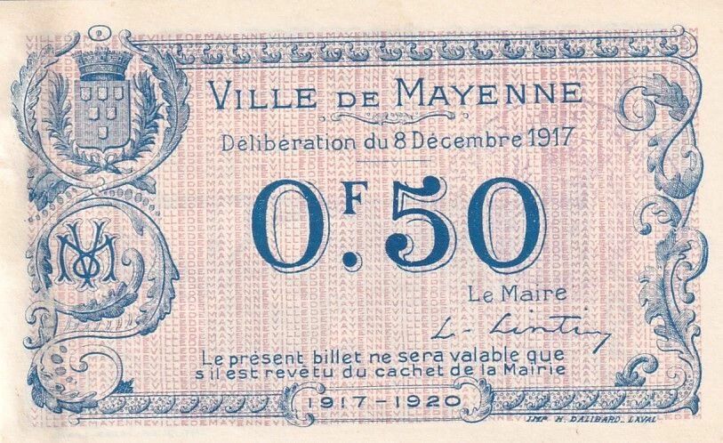 The banknote is associated with the department of Mayenne (53) and more specifically with the town of Mayenne. Identifying the issuing town is an important element for contextualizing this type of banknote.