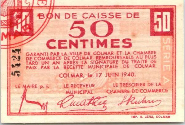 Home > French Banknotes > Necessity Money (1789-1945) > 1939-1945 > France 50 centimes , Colmar Chambre de Commerce, série A