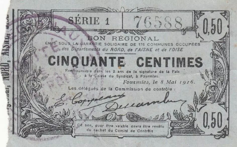 Accueil > Billets Français > Billets de Nécessités (1789-1945) > Bons de villes et de communes 1914-1925 > France 50 Centimes - Fourmies - Bon Régional - 08-05-1916 - Série 1