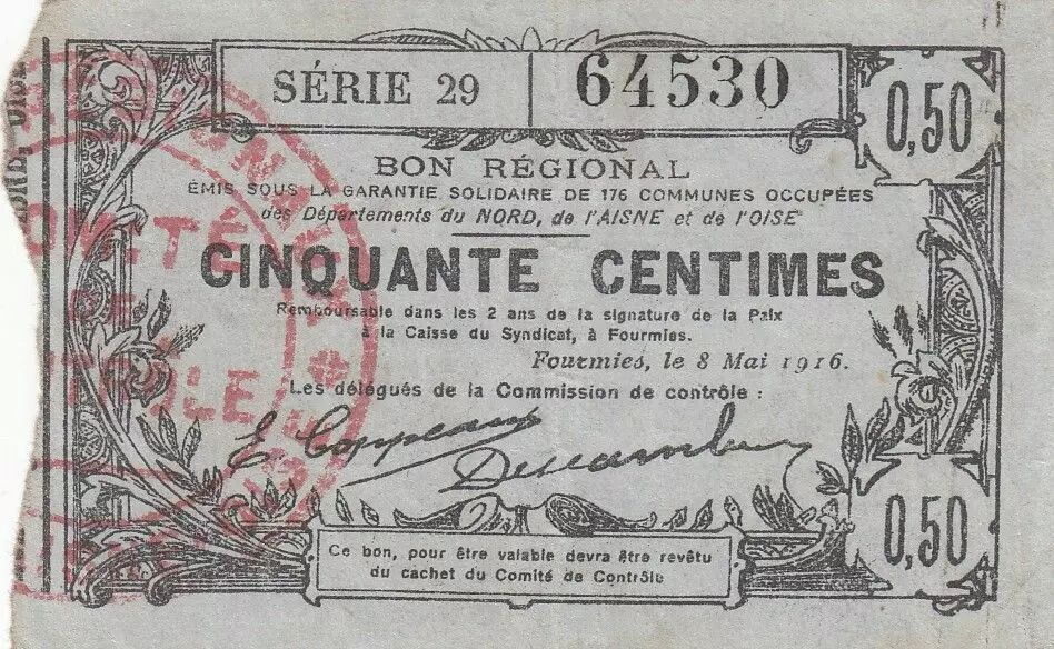 Accueil > Billets Français > Billets de Nécessités (1789-1945) > Bons de villes et de communes 1914-1925 > France 50 Centimes - Fourmies - Bon Régional - 08-05-1916 - Série 29