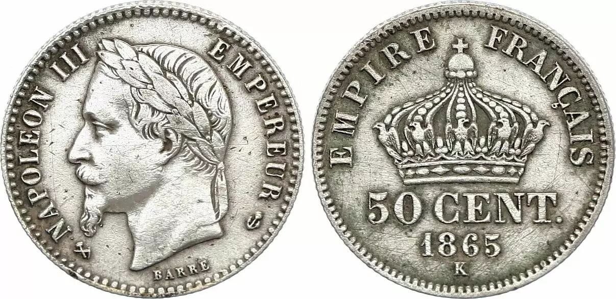 Home > French coins (470 à 2002) > Modern Currencies (1789 to 2002) > 50 Centimes / 1/2 Franc > France 50 Centimes Francs Napoleon III 1865 K Bordeaux - Silver