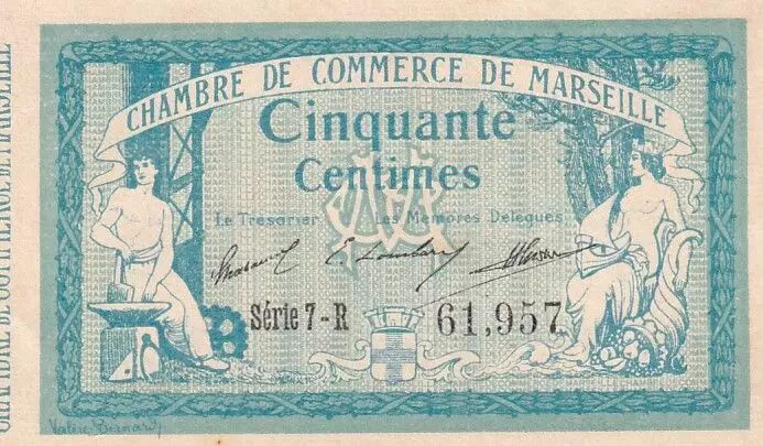 L'avers du billet présente l'inscription "CHAMBRE DE COMMERCE DE MARSEILLE" en caractères majuscules, indiquant l'émetteur de ce moyen de paiement. La valeur nominale, "50 CENTIMES", est également clairement indiquée. On y trouve les signatures du Trésorier et des membres délégués de la Chambre de Commerce, authentifiant ainsi le billet. La série à laquelle appartient ce billet est la série 7-R. Le nom du dessinateur, Valère Bernard, est mentionné, soulignant ainsi l'artiste responsable de la conception graphique du billet.