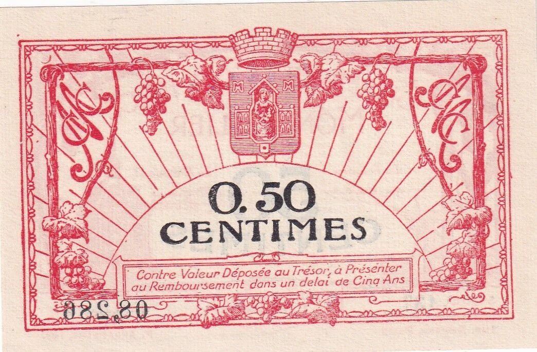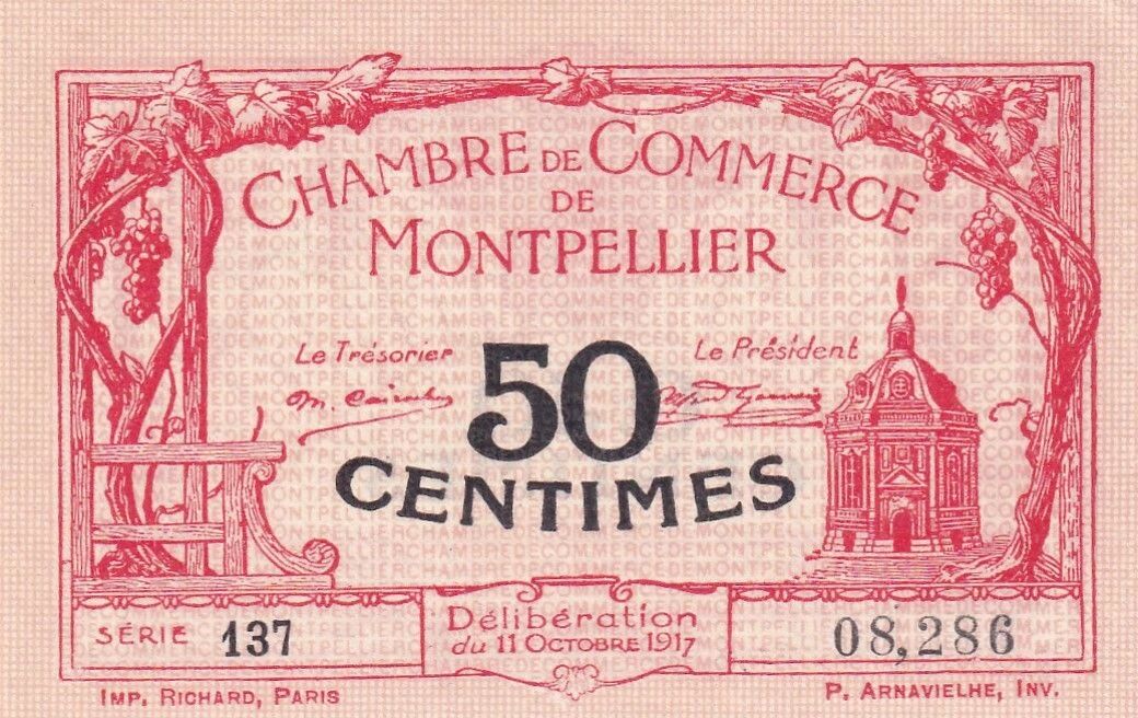 This 50 centime note was issued by the Montpellier Chamber of Commerce in 1917. It is a type of emergency currency issued during a period of shortage of coinage.