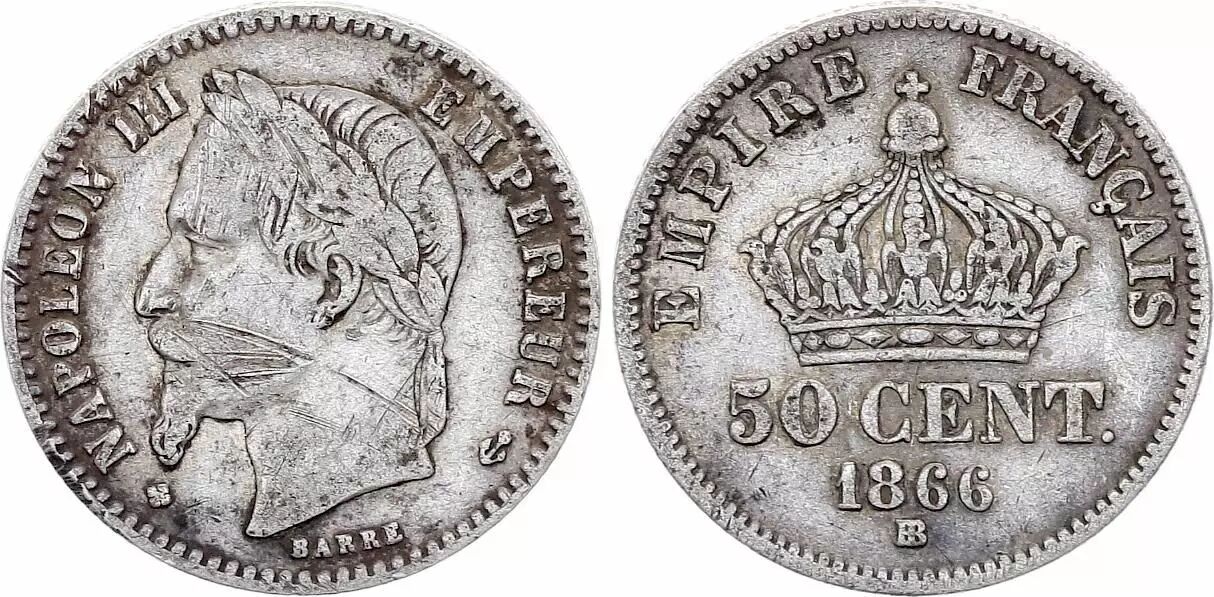Home > > France 50 Centimes Napoleon III Head Laurel - 1866 BB Strasbourg Silver