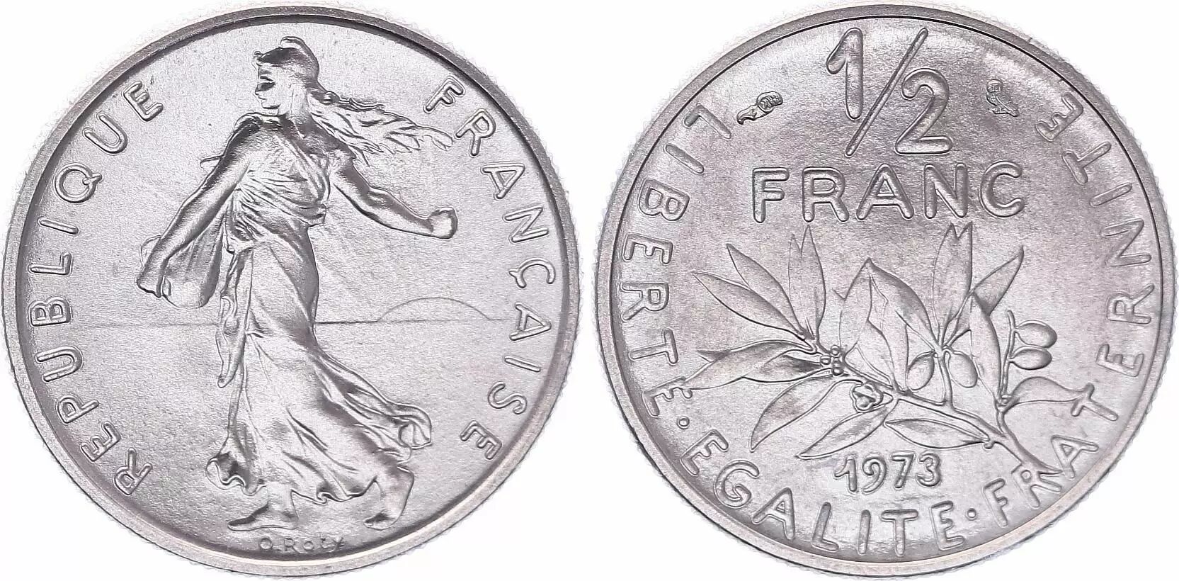 Le revers de la pièce présente un rameau d'olivier, symbole de paix et de prospérité. Ce motif est placé sous la valeur faciale de "1/2 FRANC", indiquant ainsi la valeur nominale de la pièce en ancienne unité monétaire. La devise républicaine "LIBERTE ? EGALITE ? FRATERNITE" encercle cet ensemble, rappelant les valeurs fondamentales de la nation française. La date d'émission, "1973", figure également sur cette face. Le graveur responsable de la conception du revers est également Louis-Oscar Roty, assurant une cohérence artistique entre les deux faces de la pièce.