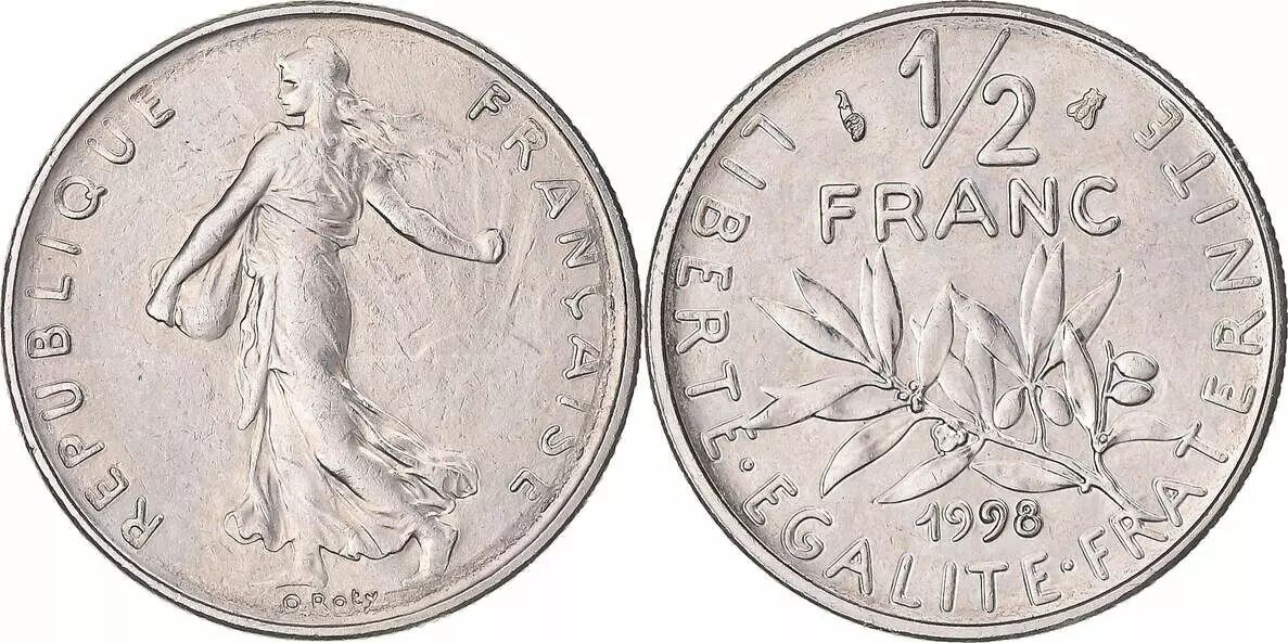 The reverse of the coin features an olive branch located under the face value "1/2 FRANC". The whole is surrounded by the French motto "LIBERTE, EGALITE, FRATERNITE". The year of issue, 1998, is also indicated. The edge of the coin is reeded.