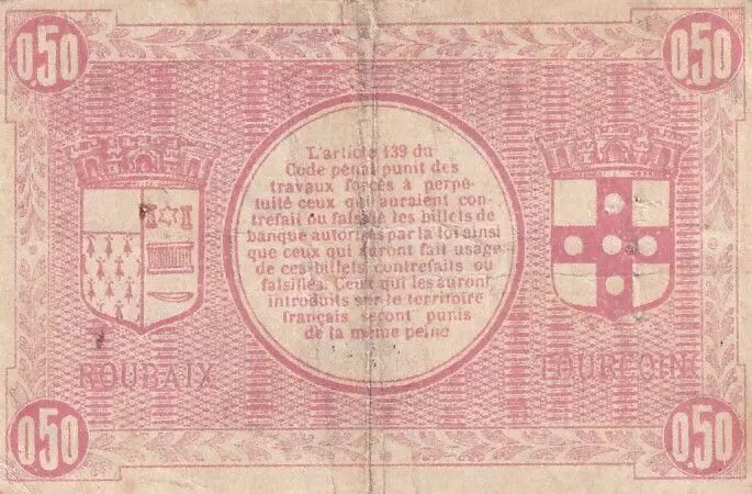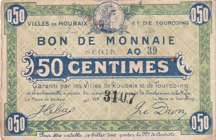 The product is a 50 cent emergency banknote issued by the cities of Roubaix and Tourcoing, referenced in Series AQ39. The text is written in Latin.