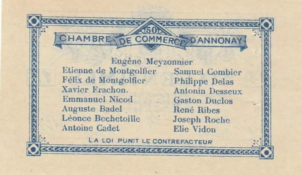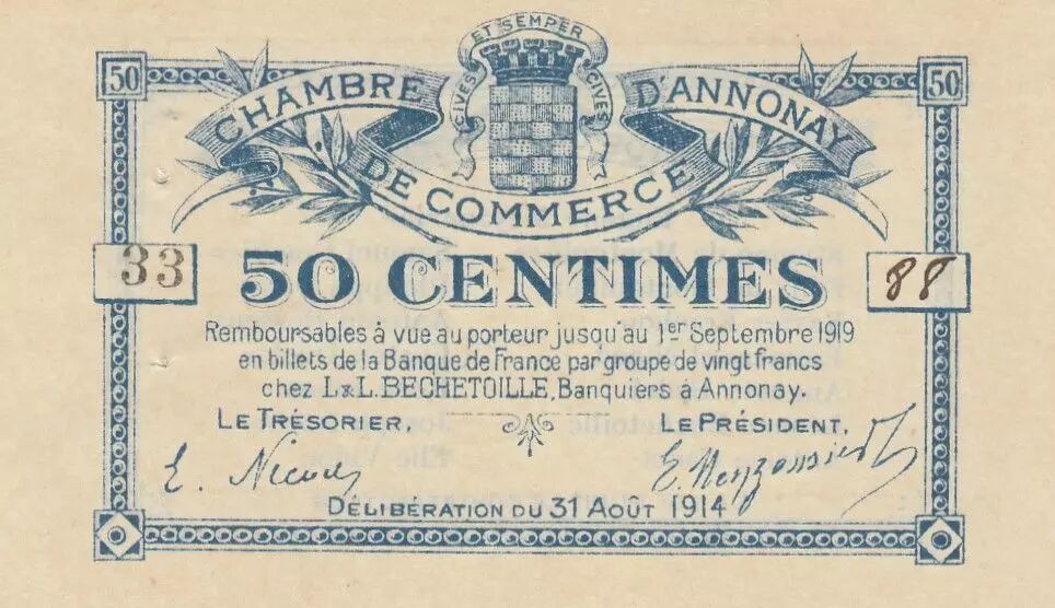 This 50 centime banknote was issued by the Annonay Chamber of Commerce in France on August 31, 1914. It is a type of emergency currency, issued during a shortage of metallic currency during the First World War.