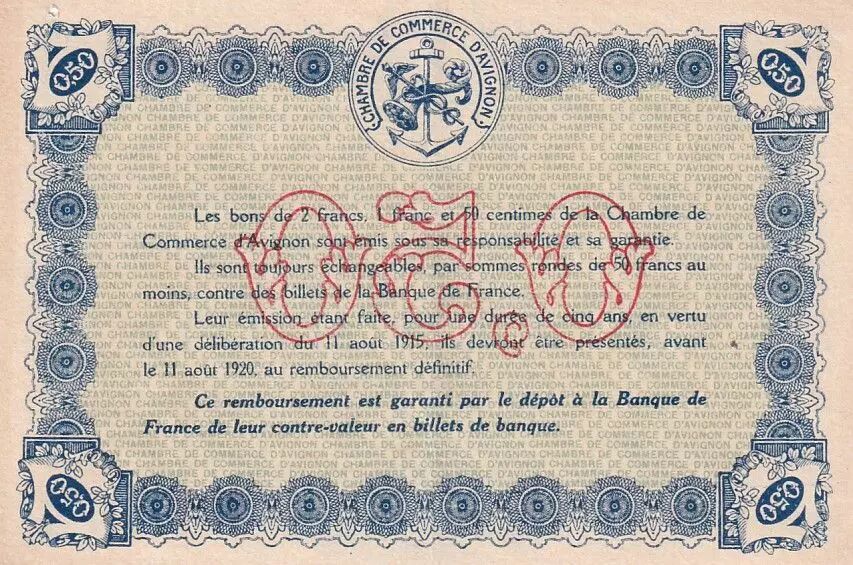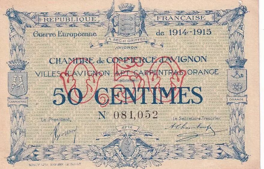 This 50 centime banknote was issued by the Avignon Chamber of Commerce between 1914 and 1915 in France. It falls within the context of the First World War, as indicated by the mention "European War of...".