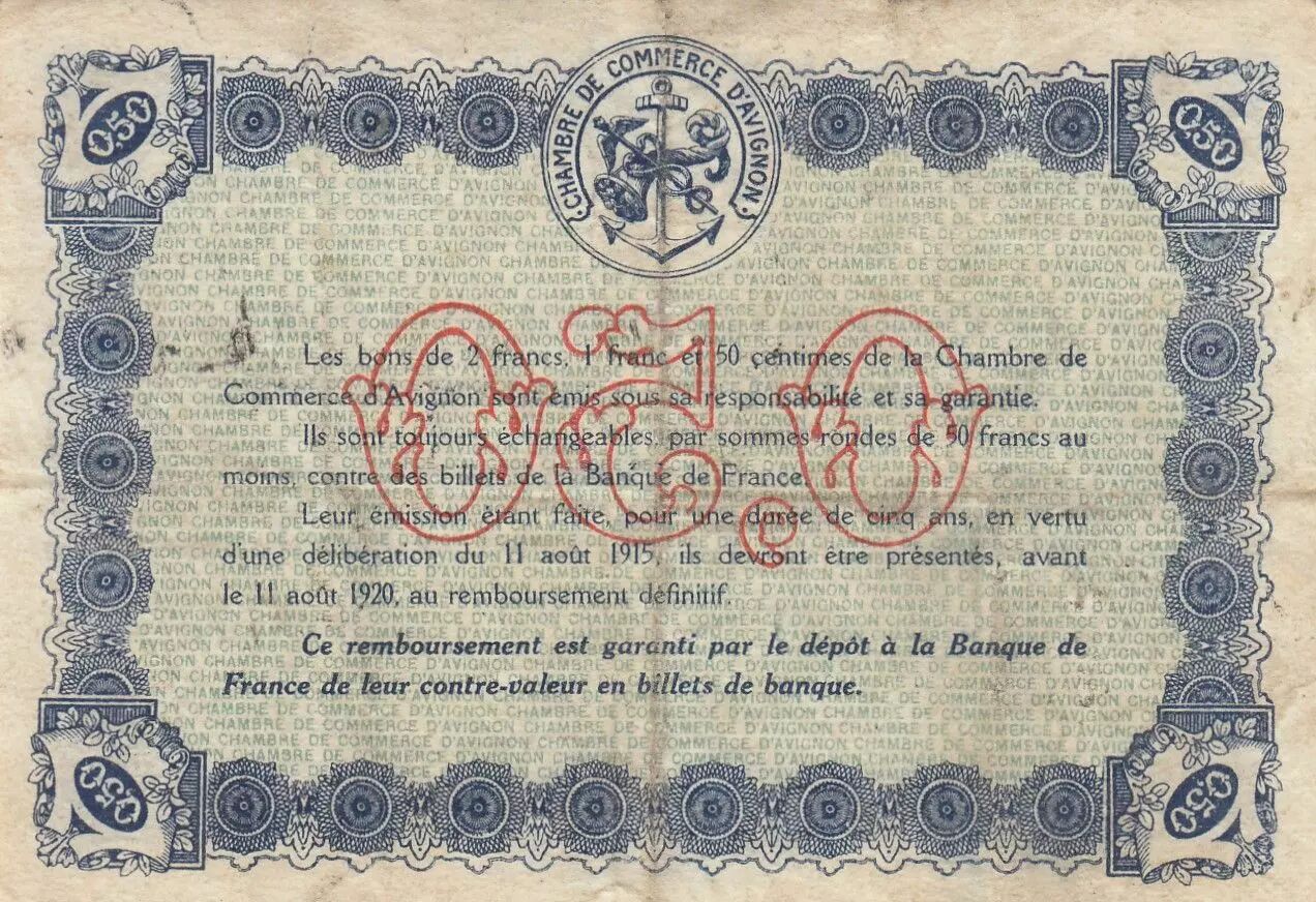 This 50 centime note was issued by the Avignon Chamber of Commerce in 1914. It is a type of emergency currency, issued during a shortage of official currency during the First World War.