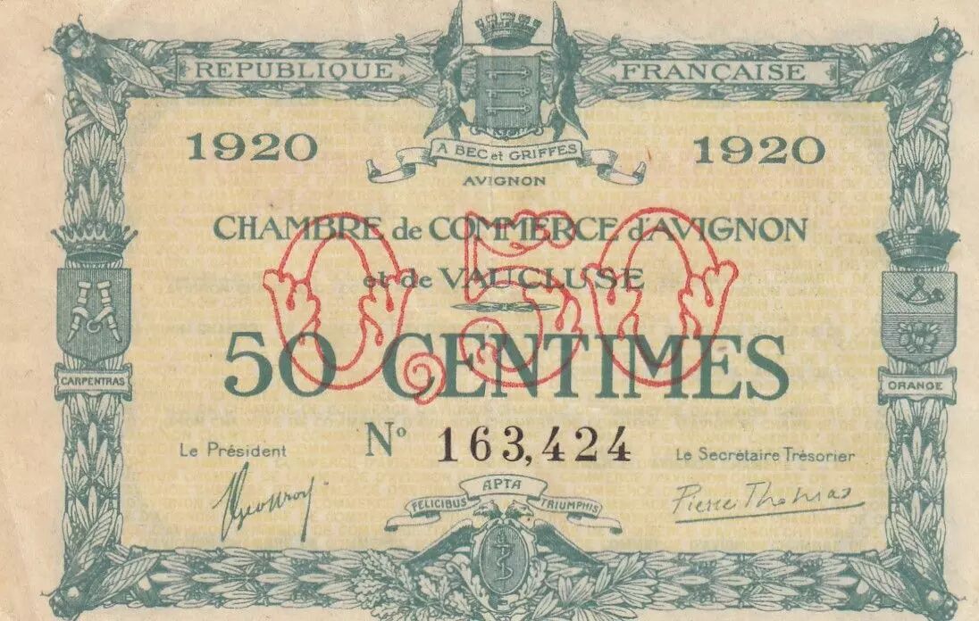 The 50 cent note issued by the Avignon Chamber of Commerce in 1920 belongs to the second series of this type of issue. This emergency note was produced in a particular economic context, marked by the consequences of the First World War.
