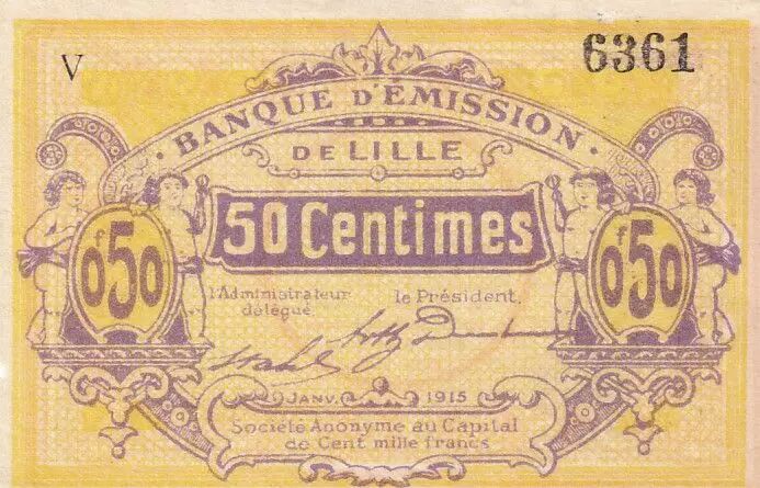 This 50 centime banknote was issued by the Banque d'Émission de Lille in January 1915. It is a banknote from Series V 6361.