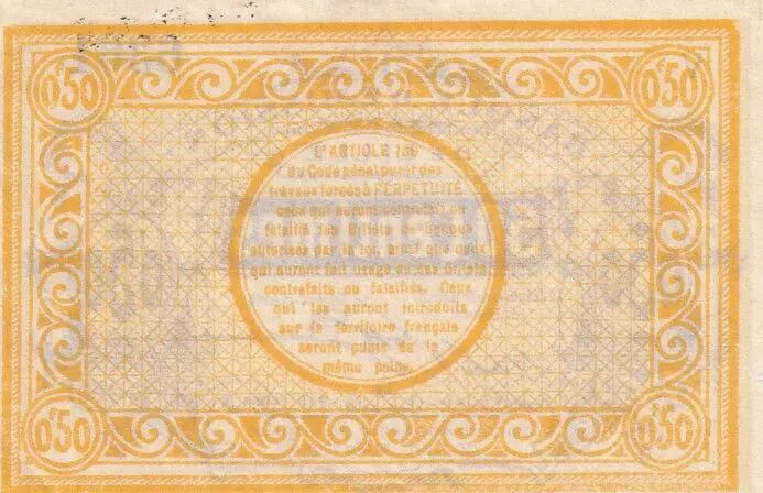 The reverse of the banknote features a legal text. This is Article 139 of the Penal Code, which details the penalties for counterfeiting or falsifying banknotes authorized by law, as well as for their use or introduction into French territory. The penalty mentioned is forced labor for life.