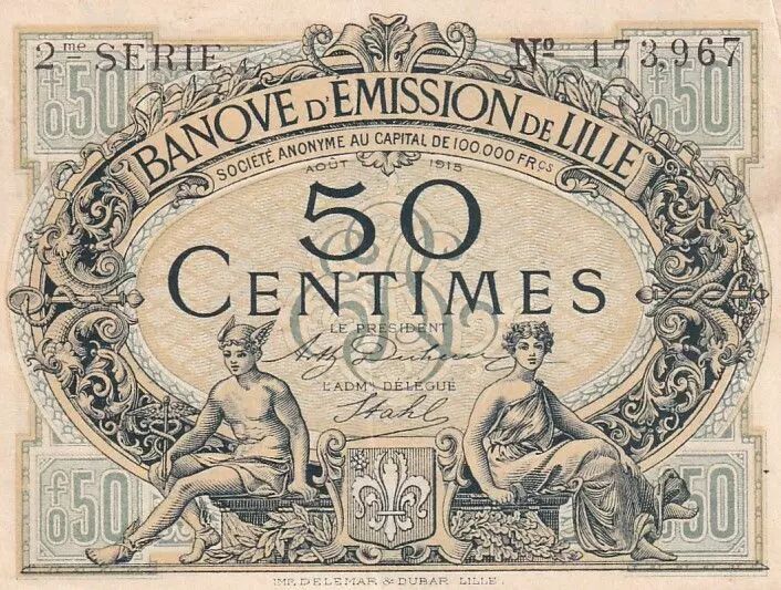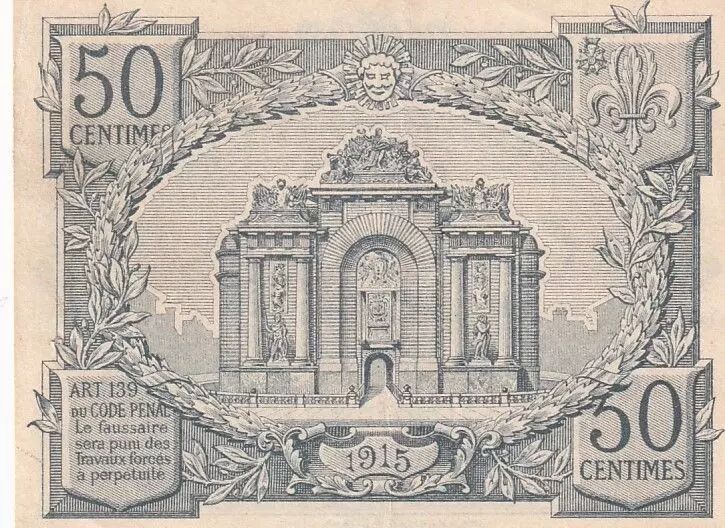 The 50 centime banknote from the Banque d'Émission de Lille, dated August 1915, belongs to the second series issued by this institution. The front of the note, written in Latin, features the following inscriptions: "BANQUE D’ÉMISSION DE LILLE AOÛT 1915" at the top of the note. The face value "50 CENTIMES" is indicated in the center.